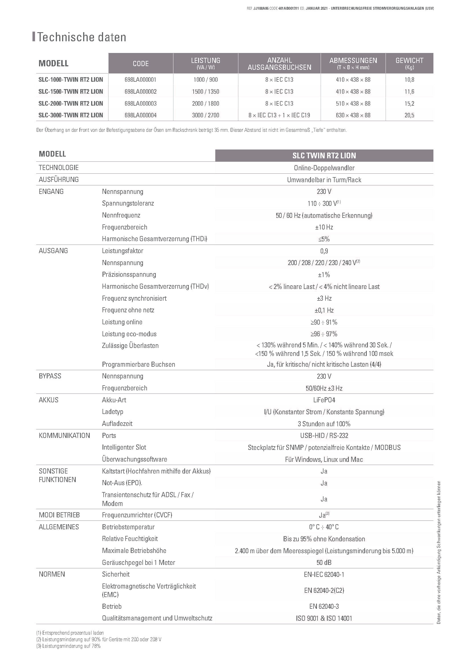 Die Serie SLC TWIN RT2 LION von Salicru besteht aus unterbrechungsfreien Stromversorgungsanlagen (USV/UPS) mit Online-Doppelwandlertechnologie, die zuverlässigste auf dem Markt. Sie verfügt zudem über Ausgangsleistungsfaktor FP=0,9, Lithium-Ionen-Batterien, umfangreiche Kommunikationsoptionen und ihre Tower/Rack-Ausführung ermöglicht die Anpassung an jede Umgebung.